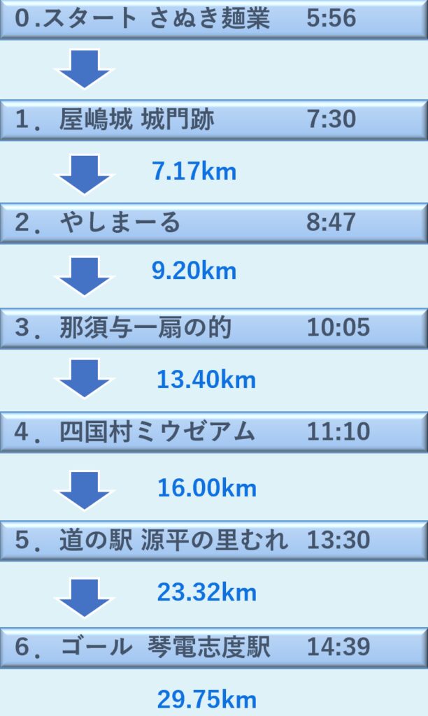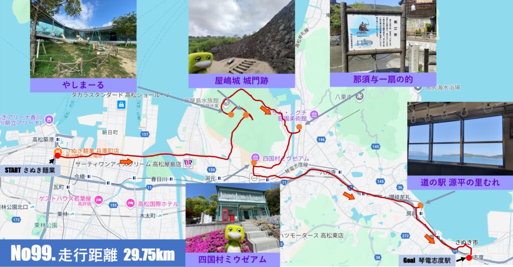 今回の旅は香川県高松市の東側にある屋島を観光した後、さらに東に向かい、琴電の終着駅である琴電志度駅まで29.75kmをランニングしました!
